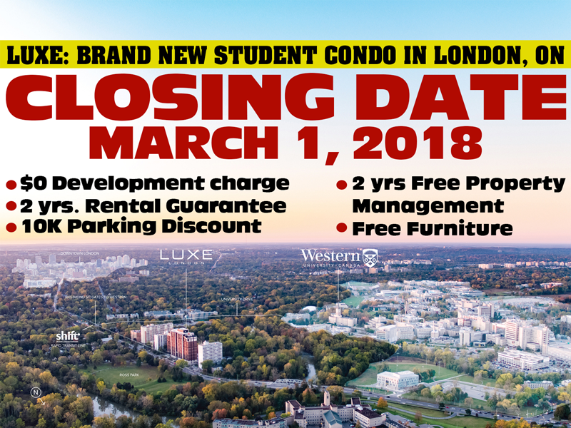 Luxe CONDO, London is the perfect location for students and young professionals to call home. Located just 10 min. from the front gate of Western University.